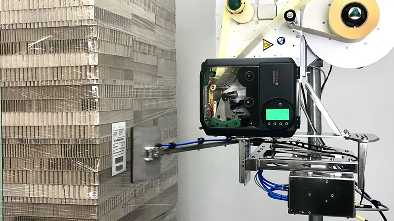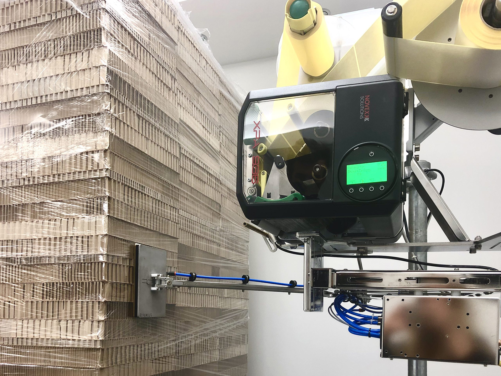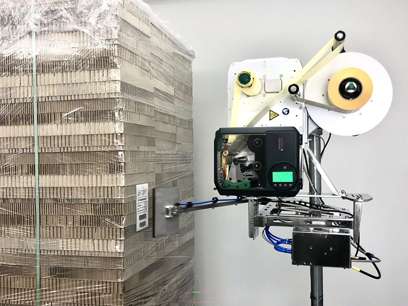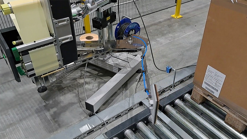 Aplikácia paletovej etikety pomocou ramena aplikátora