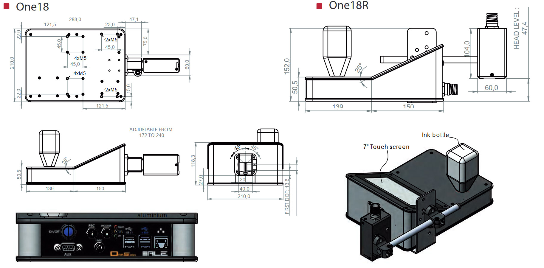 Môžu tlačiť na porézne aj neporézne povrchy pomocou atramentov na báze oleja alebo na báze rozpúšťadiel. Existujú aj dva rôzne modely: jeden iba pre bočnú tlač (One18) a druhý, dodávaný s káblom, pre tlač hore, dole alebo pod uhlom (One18R).