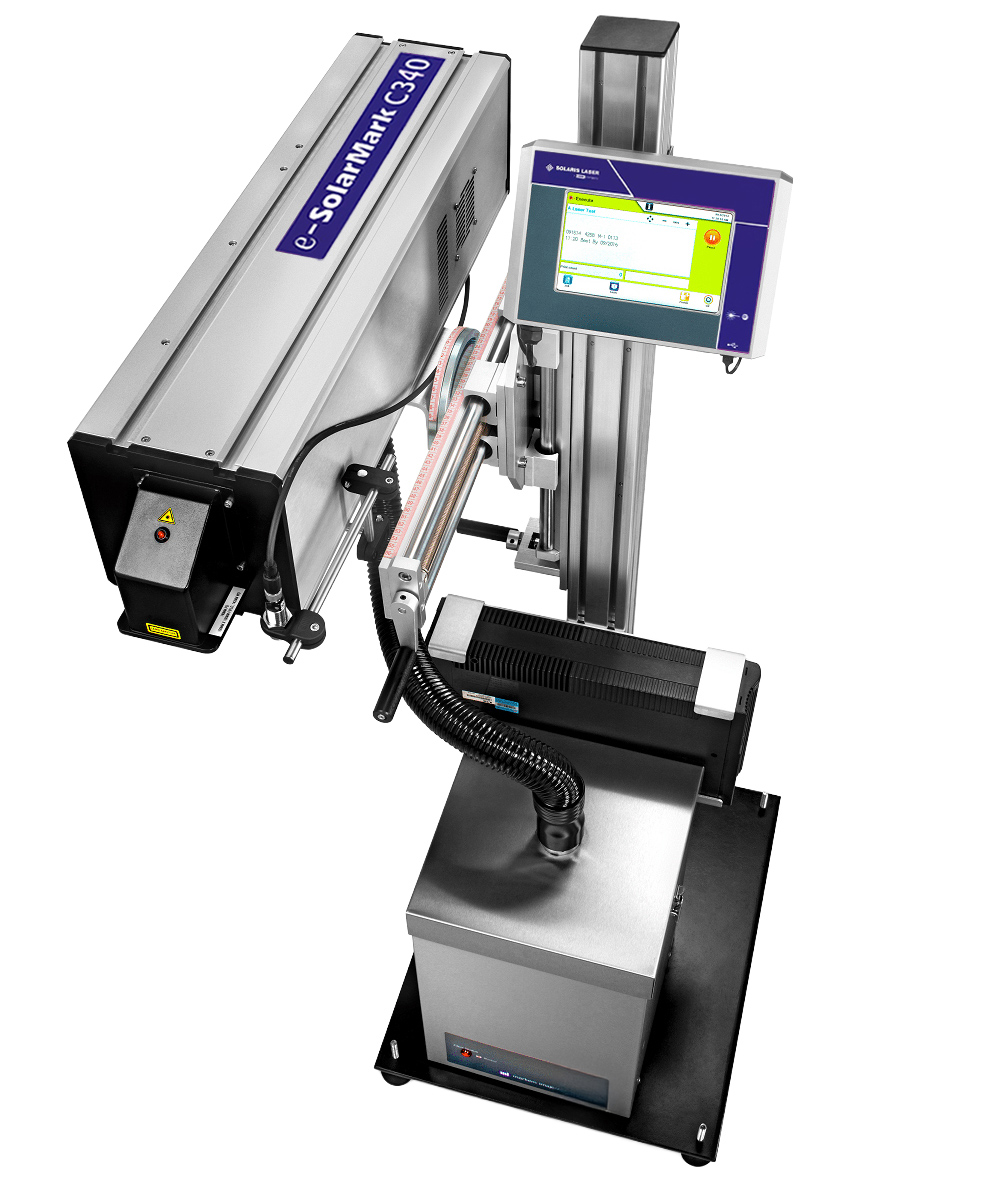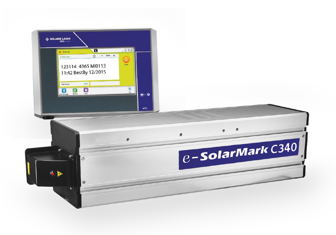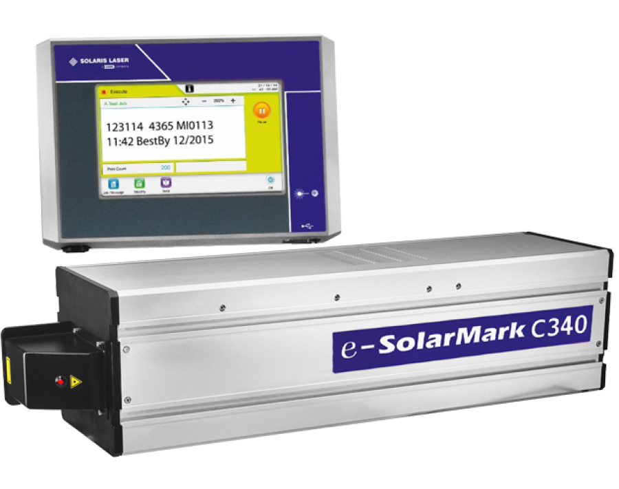 CO2 laserový značí systém e-SolarMark C340 redefinuje štandardy priemyselného značenia a kódovania vďaka svojej kompaktnej konštrukcii typu „všetko v jednom“. Systém má krytie IP44 a spoľahlivo funguje až do 45 °C. Vďaka 7“ dotykovému WYSIWYG rozhraniu alebo webovému ovládaniu minimalizuje riziko chýb obsluhy a maximalizuje produktivitu výrobnej linky.