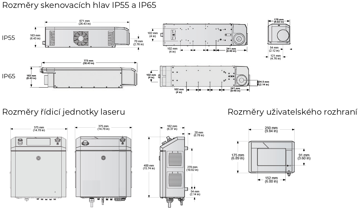 | Hmotnosť lasera: | riadiaca jednotka 10,2 kg, užívateľské rozhranie 2,1 kg, skenovacia hlava 18,5 kg |